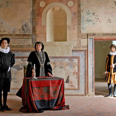 Dans la salle des fresques, Catherine de Médicis (Eliane Bignon) discutait avec ses deux fils, le roi de France Charles IX (Thibault Langlais) et le futur roi Henri III (Fabien Simon). Ils évoquaient les initiatives à prendre pour mettre fin aux complots protestants. Leur hôte, le maréchal de Vieilleville (Erick Jasnault) surprenant une conversation qu'il n'aurait jamais dû entendre, était retrouvé mort sur son lit le lendemain matin…